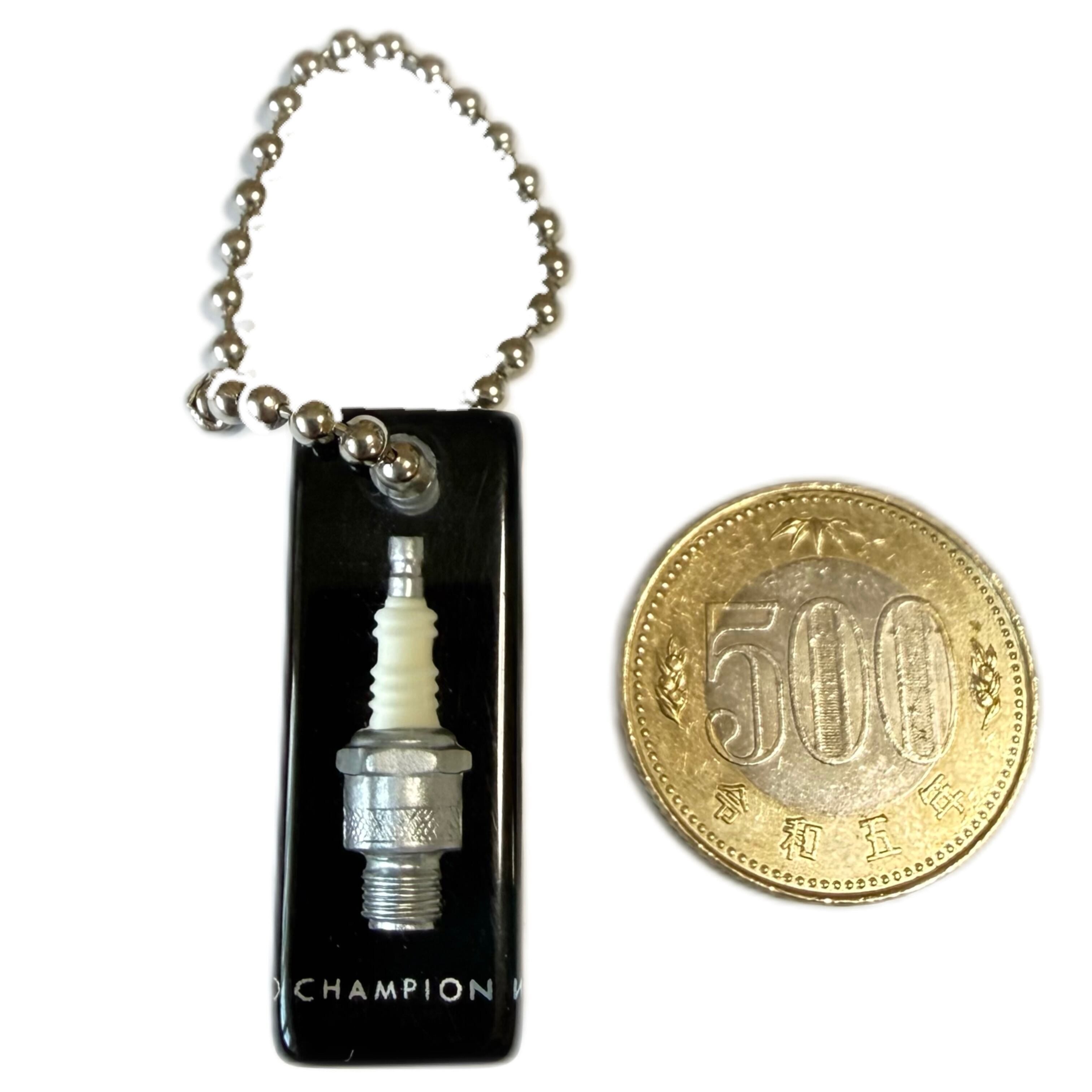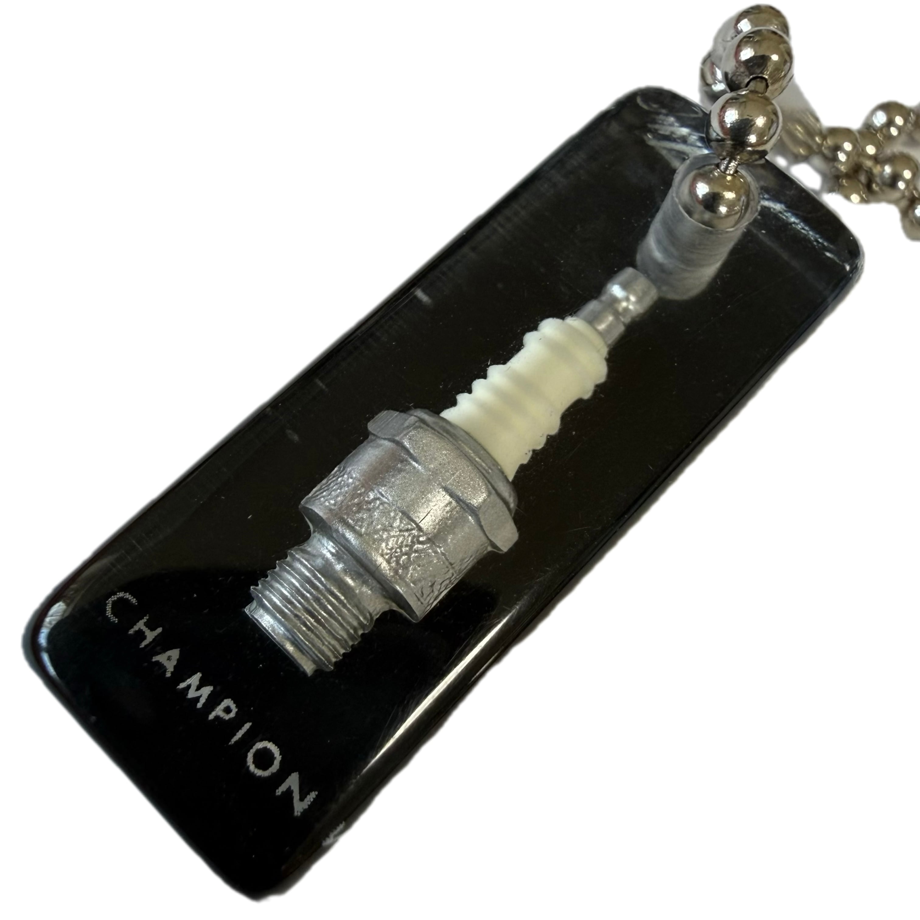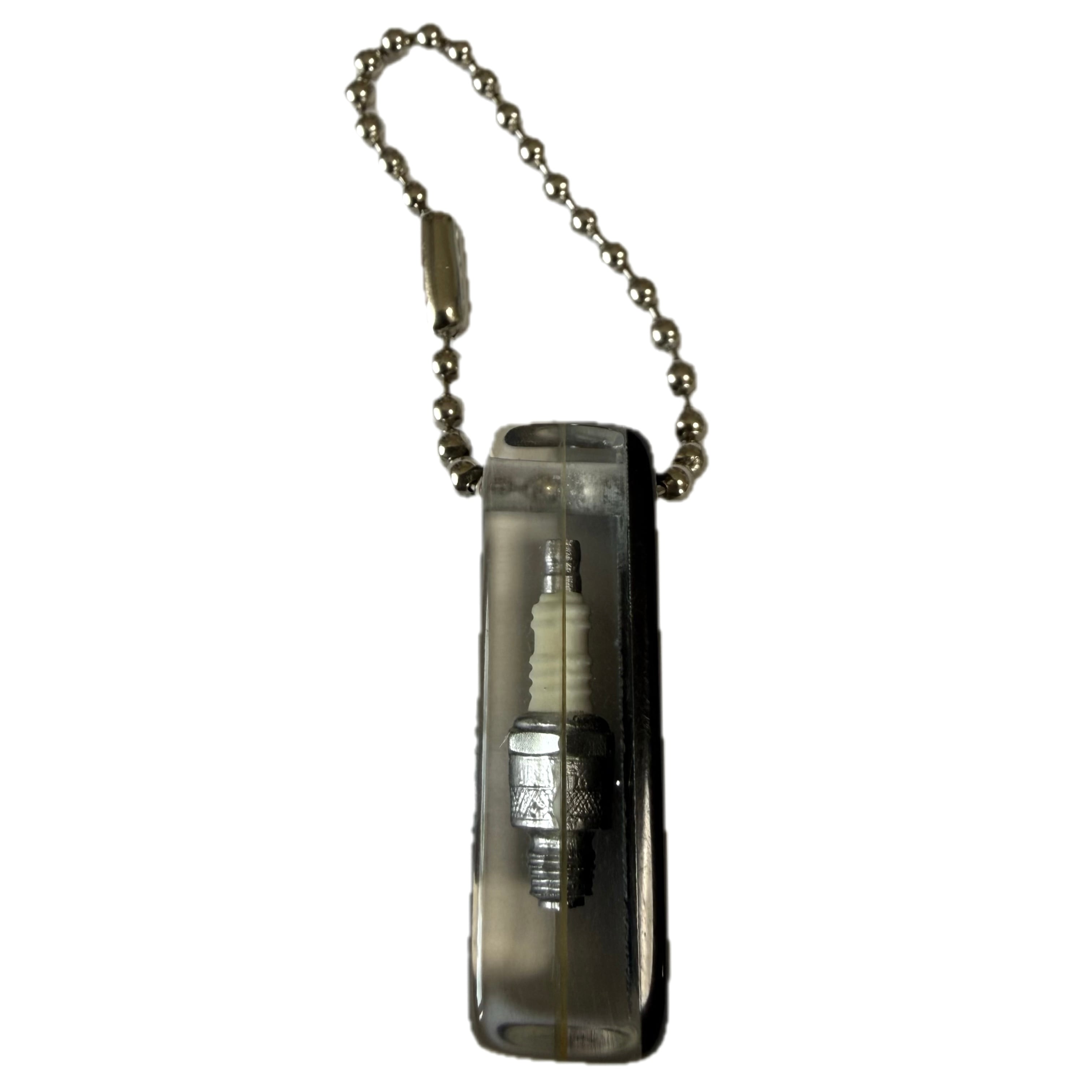 本物そっくりのスパークプラグがアクリルの中に閉じ込められている。