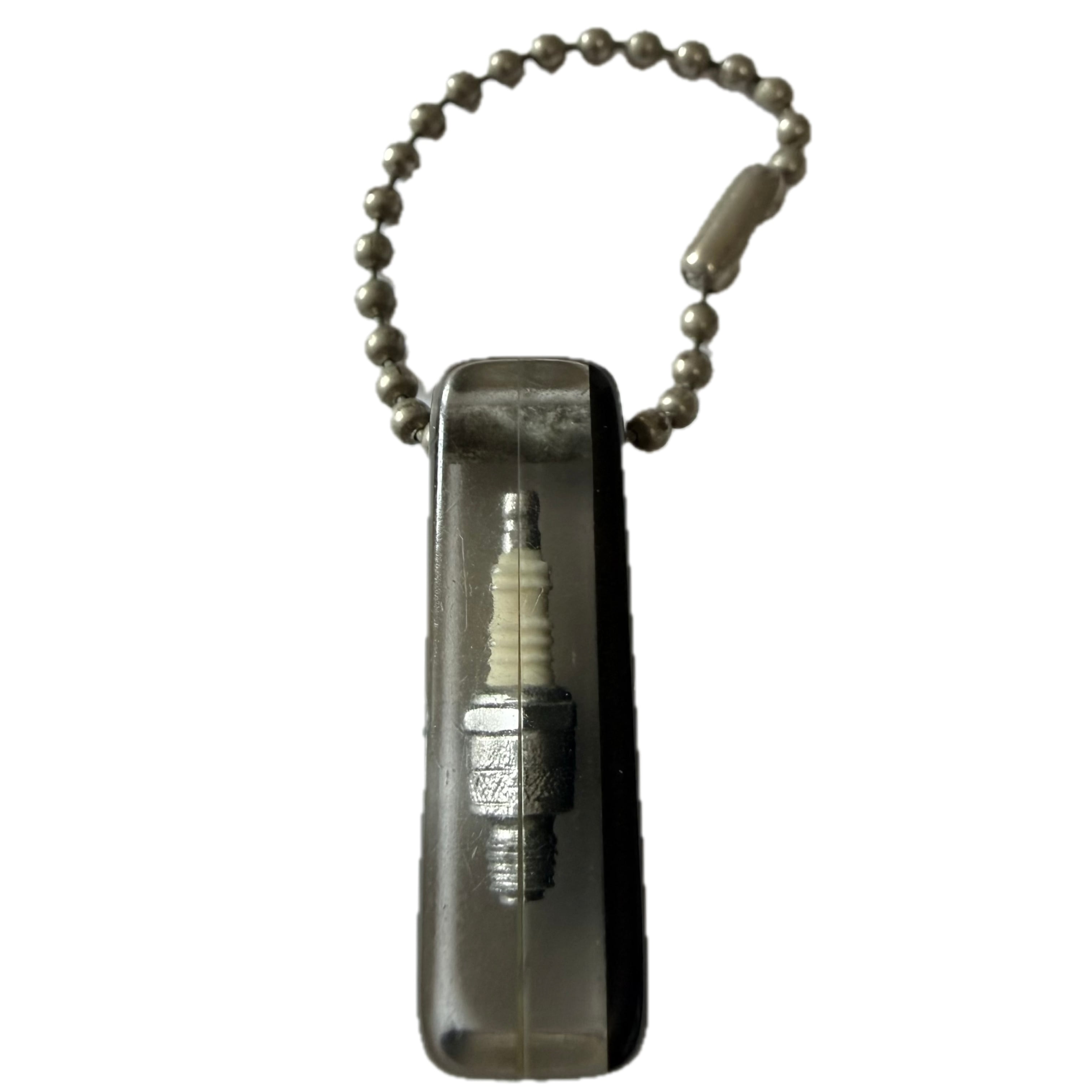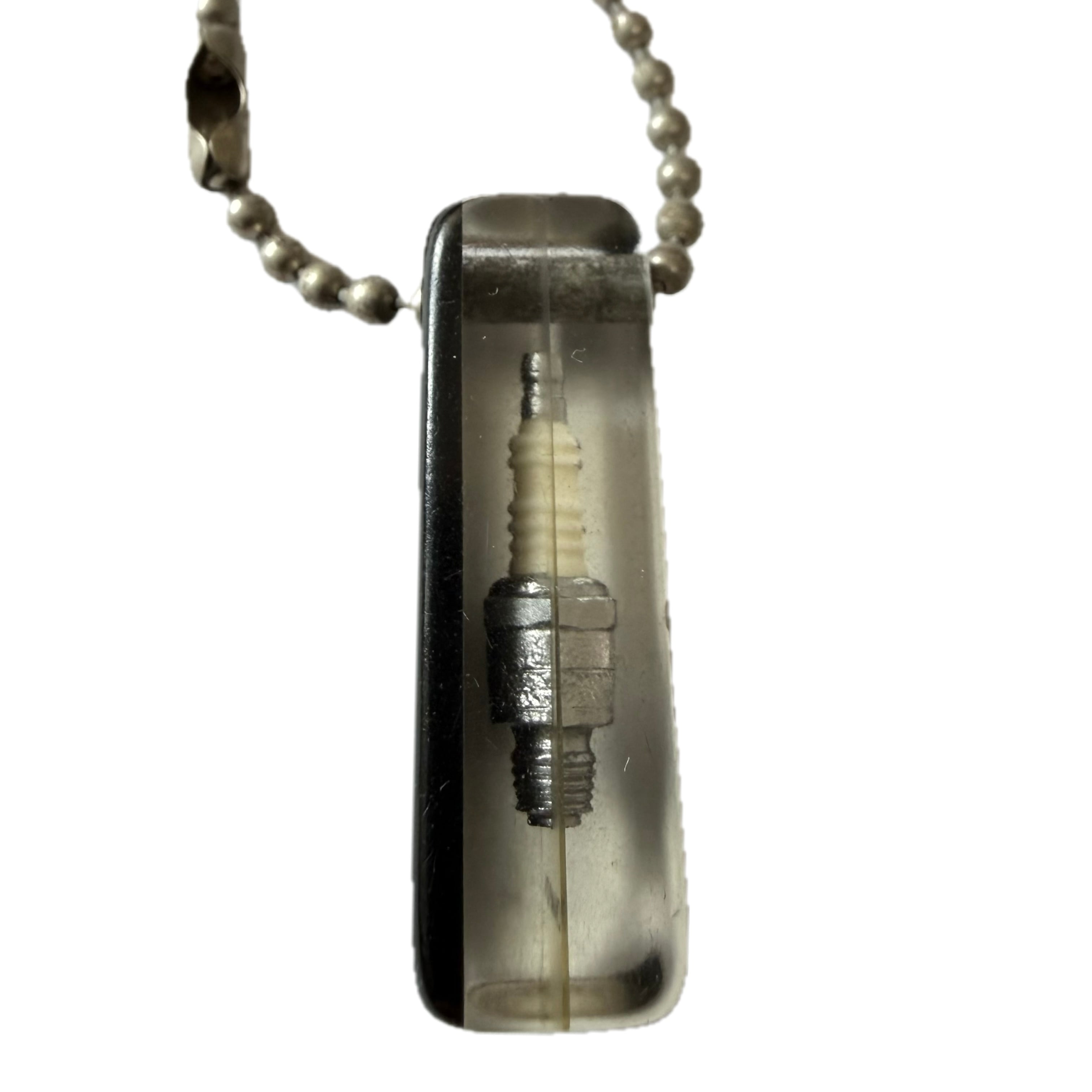 本物そっくりのスパークプラグがアクリルの中に閉じ込められている。