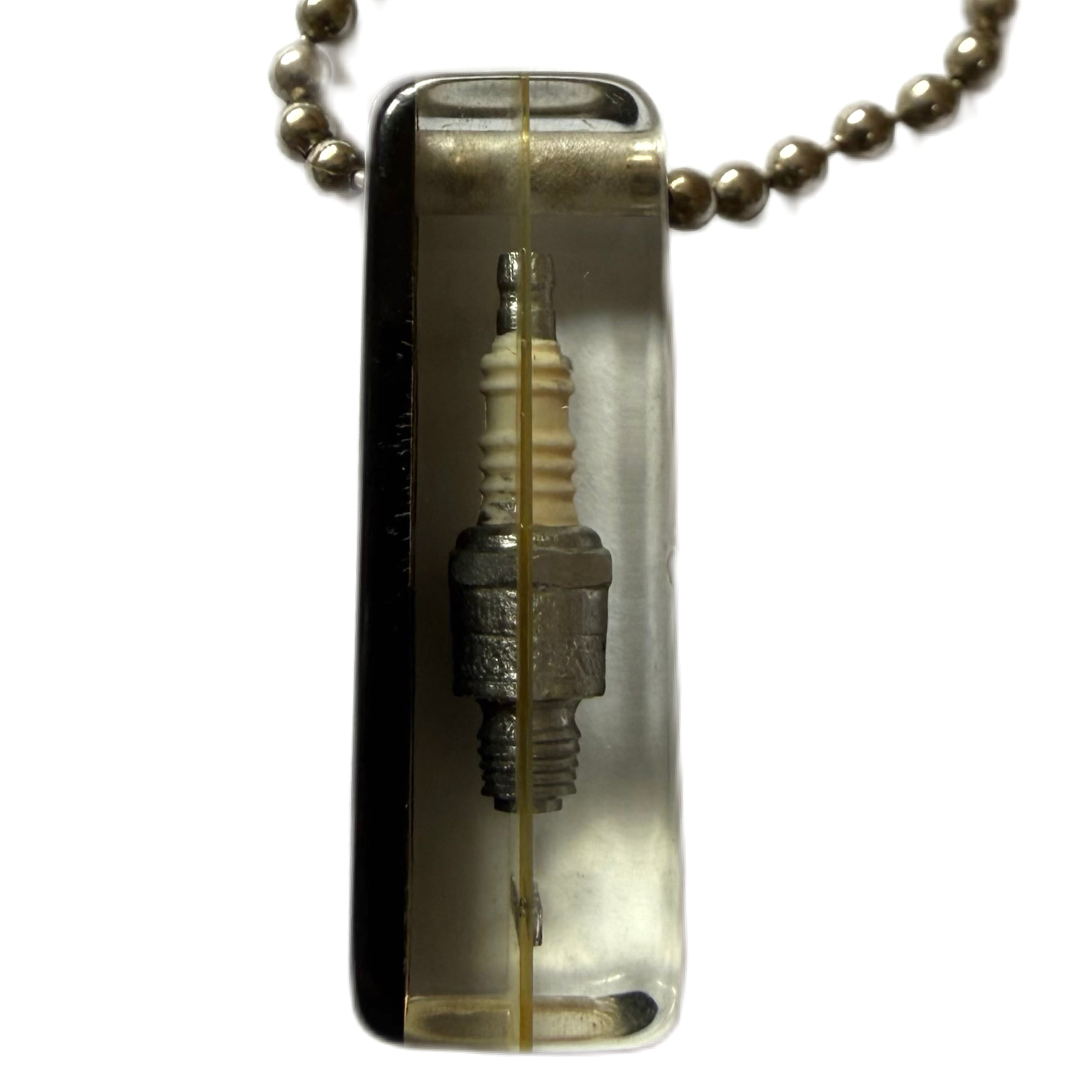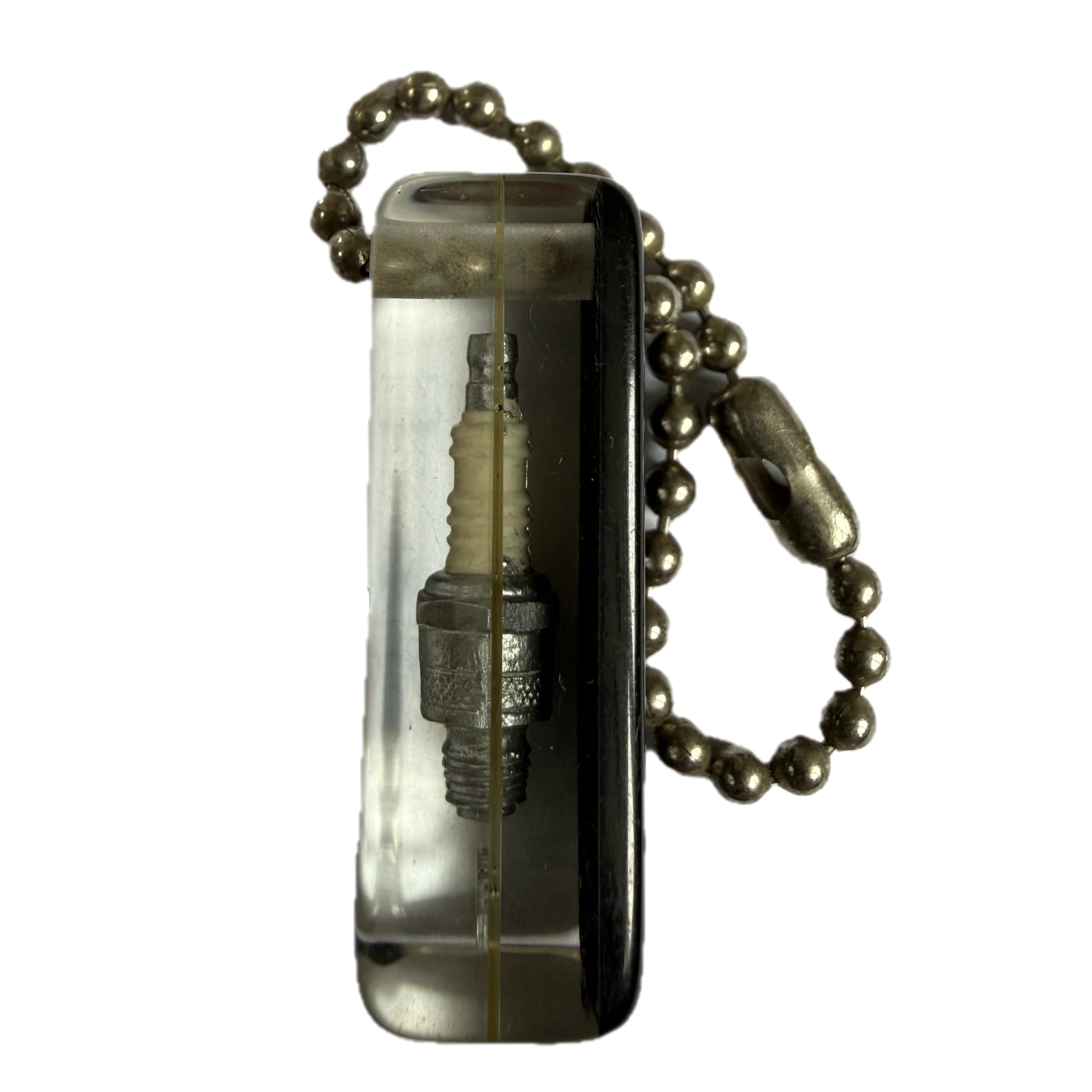 本物そっくりのスパークプラグがアクリルの中に閉じ込められている。