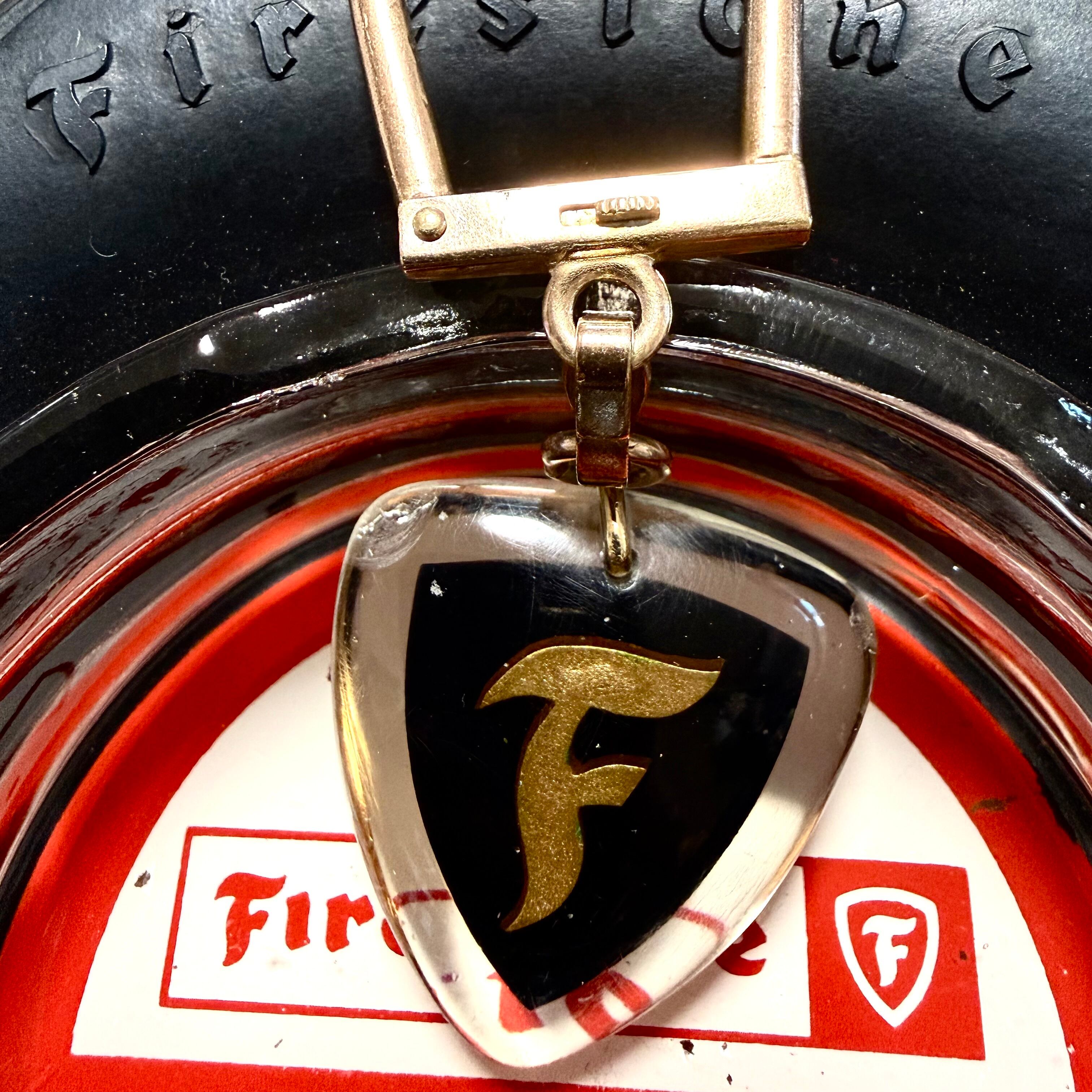 フロントにはタイヤ&ブランド名、バックにはFの文字がアクリルの中に閉じ込められている。